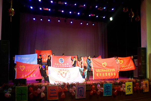 为庆祝我院青年志愿者协会成立13周年,进一步扩大青年志愿者协会在学院的号召力,不断发展壮大协会的规模和力量,青年志愿者协会于2013年12月6日星期18:00在大学生活动中心隆重举办了以“一路有你”为主题的十三周年庆典晚会。 本次晚会出席的嘉宾有:校团委书记龙新良,学前教育学院基层团委书记王坤丽,机械学院基层团委书记刘阁,青年志愿者协会指导老师寻芬,校团委宣传部部长兼社团指导老师毕璇,校团委大学生艺术团指导老师周子馨以及协会第十一届、第十二届委员代表们和各大驻济高校志愿者代表们。