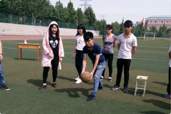 21日上午9点30分,42名同学在田径场主席台前集合签到完毕,所有成员分成A、B、C三队。选出队长后,素质拓展活动拉开了序幕。最先进行的是空中劫击游戏,同一队的两名队员拿着两个篮球彼此站在7米外,哨声吹响后,两名队员必须同时抛球,当球在空中相撞则完成任务。每队共有10次机会,碰球数最多的队伍获得胜利。经过5分钟的准备时间,比赛开始了,C队队员齐心协力,配合默契,一共碰到6次球,获得了比赛的胜利。