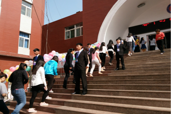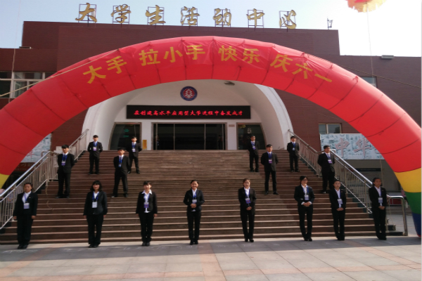礼仪与服务工作由青年志愿者协会副会长辛世元负责,学生会、 团委委员、青年志愿者协会共20人参与了此项工作。场内礼仪工作人员在27日上午就开始进行培训,29日上午她们身穿蓝色礼仪服装迎接领导入场,展现出了英才学子英姿飒爽的精神风貌;场外礼仪工作人员负责引导家长和孩子签到入场就坐,并给孩子们发放礼品,炙热的太阳、流淌的汗水没有让他们喊苦喊累,得到了老师家长的肯定。
