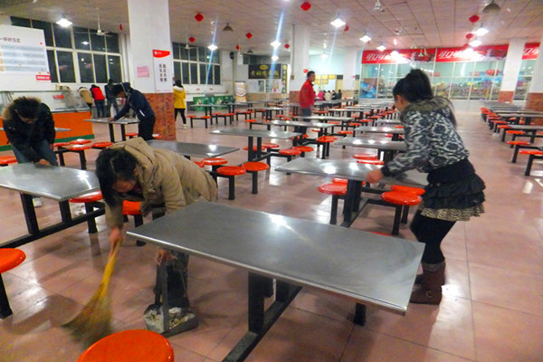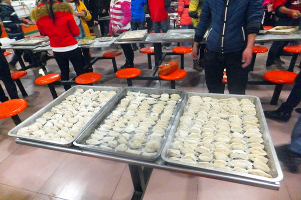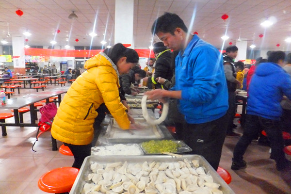 进入餐厅,协会部员们就把餐厅部分桌椅摆成两列,然后按照小组分别站在桌椅两侧。随后餐厅工作人员拿来了面粉、饺子馅、擀面杖等包饺子所需的材料、工具。包饺子这时正式开始,部员们有的和面,有的擀饺子皮,有的包饺子,忙的是不亦乐乎。从远处望去,两列包饺子的部员们形成了两列长龙,在餐厅中格外显眼。本来周六安静的餐厅由于志愿者们的到来顿时充满了欢声笑语,志愿者们还发挥他们天马行空般的想象力,把饺子包成各种形状:有的像鲤鱼、有的像元宝。有的志愿者还在饺子了放上事先追备好的硬币,代表了对协会的深深祝福。待所有的饺子都包好,部员们把所有包好的饺子端到餐厅后厨下锅煮饺子。等待了一会,部员们又把热气腾腾的饺子从后厨端了出来,部员们吃着自己包的饺子,每个人脸上露出了幸福的笑容。活动结束后,志愿者们把桌椅回归原位,用抹布擦除桌子上残留的面粉并打扫了地面上的垃圾。