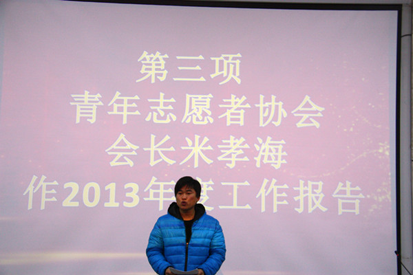 2013年12月30日下午4:30,青年志愿者协会在E楼阶梯一教室成功举办了2013年度总结大会。团委书记龙新良,青年志愿者协会指导老师寻芬出席了本次大会。