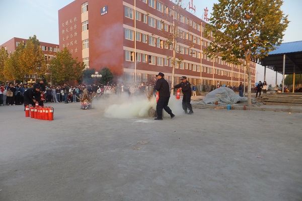 接下来,是消防队的营救演练了,消防消火,消防员熟练的用扑火器把水洒向楼层高处。随后使用灭火器进行展示与解说。进行灭火演示的时候,消防队员先告诉同学们如何使用灭火器,然后点燃火堆进行灭火演示,最后选了几个学代表去体验使用灭火器。同学们谨慎的拿着灭火器,把那场火给扑灭了。参与活动演练完,消防队员再次给同学们做示范,让同学们更好的记住灭火器的使用方法以及着火逃生的方法。