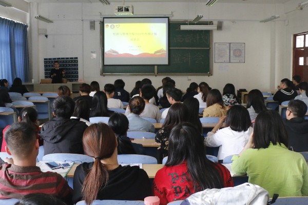 为了参加西部计划的同学们更好的了解西部计划的生活安排,经济与管理学院于2018年4月17日下午2点在经管楼202召开西部计划宣讲会。参加此次会议的领导有经济与管理学院党总支副书记王广柱、经济与管理学院基层团委书记赵昆,参加此次会议的人员有2013届学长丁栋梁和2014级本科、2015级专科西部计划预报名人员。此次会议由经济与管理学院基层团委社会实践部部长那瑜真主持。