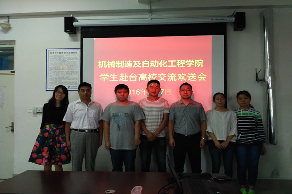 为增进两岸文化交流,拓宽我校在校生视野,全面提高人才培养质量,经学院推荐、学校审批,遴选出张智宏、马壮壮两位学生于9月初赴台湾义守大学进行交流学习。为确保学生顺利赴台学习,我院于9月7日组召开了交流欢送会。机械学院院长刘延利、副院长孔祥泉、蒋丽丽,辅导员秦路、裴斐以及两位赴台学生参加了此次欢送会。