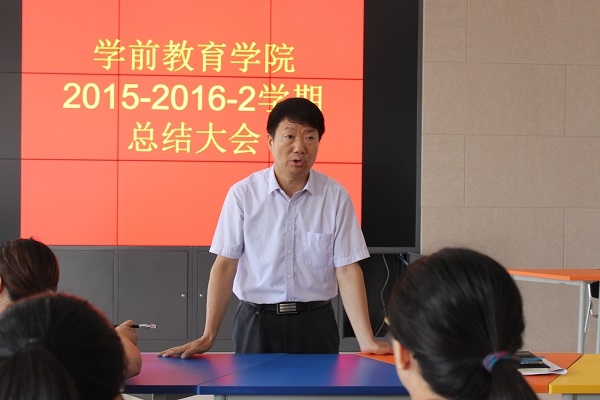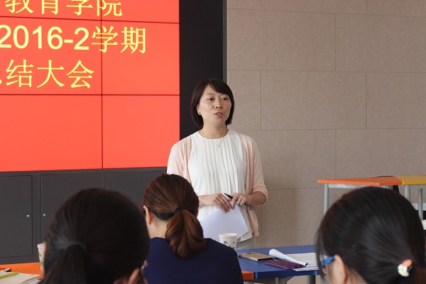 接着,学院几位分管领导对学期工作做了总结。夏竹筠院长讲到今后努力为教师们提供走出去提升的机会,站在不同的角度了解学院的各项发展。她还通过山东省优势学科这一荣誉的取得阐述了全体教师们在科研方面所做的努力,并借中美对话学前教育大会实例,引发老师们对自身能力和能否利用学院所搭建的平台进行提升的思考。