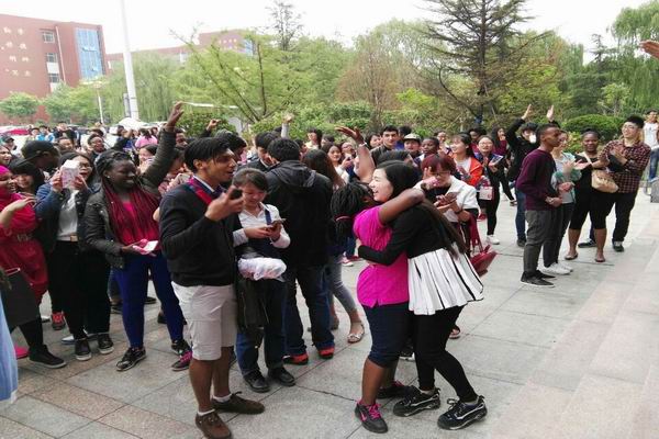 随着欢快的舞曲旋律,中外学生一起跳起了动感十足的“兔子舞”,他们动作整齐、娴熟,场面壮观,展现了中外学生朝气蓬勃、健康向上、充满自信的风采,此次活动也达到了高潮。下午5点左右,联欢活动圆满结束,大家恋恋不舍,纷纷互赠礼物,合影留念,并且相互留下了联系方式,彼此间已成了好朋友。