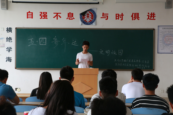 为弘扬五四精神,引领思想,经济与管理学院基层团委学生会生活部、科技创新部、社会实践部联合举办了五四青年运动文明校园活动。各班级学生代表及团学干部参加了此次活动。