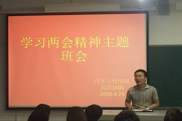 为学习贯彻十二届全国人大四次会议和全国政协十二届四次会议精神,4月26日晚,汽车工程学院学生在汽车楼3007教室召开学习了“学习两会精神”主题班会,由付高建老师带头进行了重点学习与讨论,高职班的同学均参与其中。