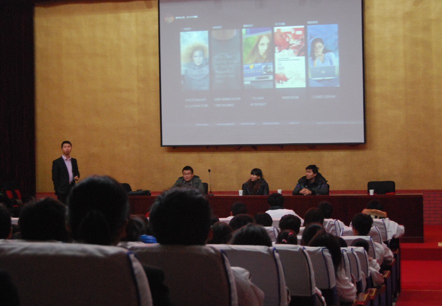 首先张老师给大家的专业做了一个全新的定义,即:互动媒体设计、数字媒体、影视动画;并介绍了Photoshop、Flash等设计类用的软件。当张老师播放用此类软件做的作品时,使同学们深深认识到最简单的也能做出华丽的效果。随后张老师又拿出了一些广告作品与同学们一起分享,让同学们大开眼界。这次张老师带给我们的并不只是高科技,还交给我们了如何更好的生活、更好的做好工作!