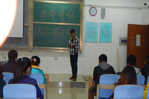 为进一步响应国家号召,切实做好我院西部计划志愿者招募工作,鼓励更多的大学生投身西部建设热潮,商学院基层团委学生会 于11月23日在综合楼4010组织召开西部计划动员大会。商学院基层团委书记邢辉主持会议,西部计划大学生志愿者代表参加。