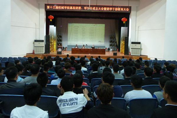 2016年4月15日晚7时,机械学院基层团委、学生会成员全体成员在大学生活动中心隆重集会,举行第十三届机械学院基层团委、学生会团学干部成立大会,机械学院孔祥泉副院长受邀参加了本次成立大会,会议由基层团委书记刘阁主持。