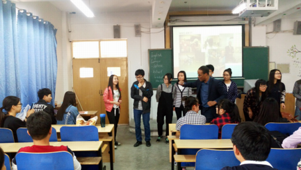 此次英语角活动得到了学院领导老师们的大力支持,英语角活动进行的如火如荼。在英语角开始环节,外教Micah先进行自我介绍,并将自己的家庭成员介绍给大家,拉近了与同学们的关系。Micah要求同学们分组讨论、相互认识并选出每组的leader;接下来同学们以组为单位,用英文相互展示介绍自己,毫不怯场,为此展现了我校学生的非凡魅力。
