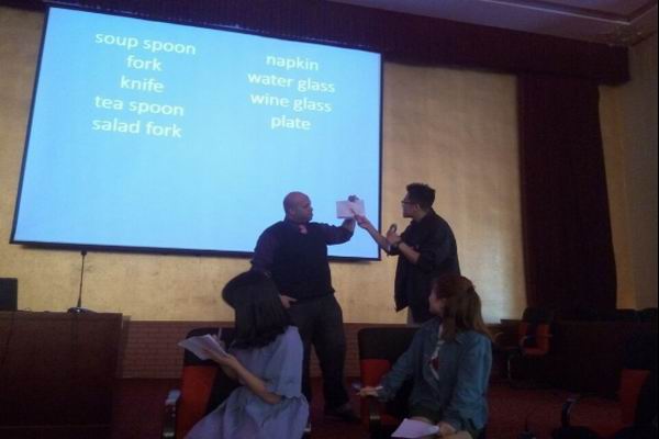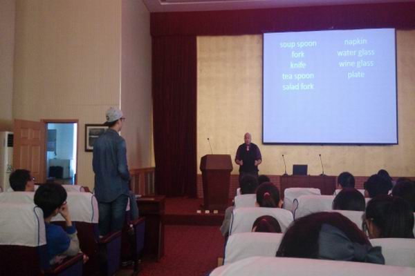 为继续提高我校非英语专业学生的英语水平,开阔学生的西方文化视野,增强英语学习兴趣,外国语与国际交流学院于2016年4月18日(周一)12:15-13:30在我校南校区学术报告厅成功举办了题为“Western Table Manners---外教Brian带你走进西方文化”的讲座,此次讲座主要由外国语与国际交流学院外语实训室与外院基层团委共同举办。该讲座的成功举办与学校各级校领导的大力支持是分不开的。讲座开始前主持人姜冬梅,周润成两名同学分别用流利的,专业的中英文双语介绍到场的领导和老师们,随后讲座在张艳芳副院长热情洋溢的开幕词中拉开了序幕。