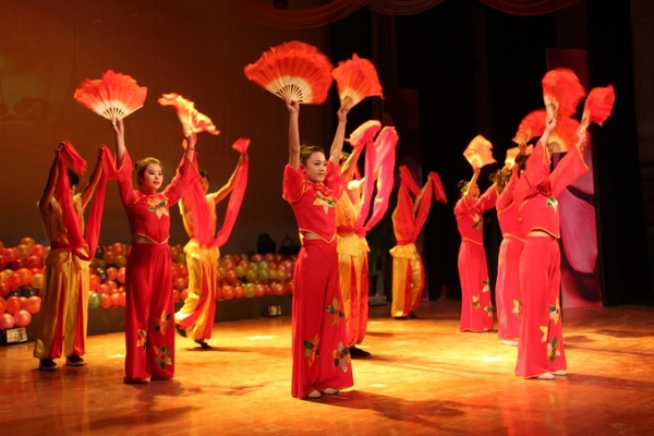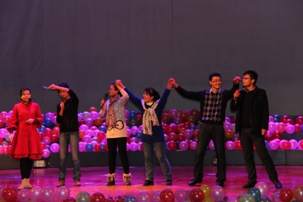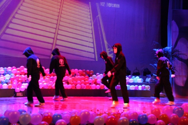 晚会以大气磅礴的水鼓舞作为开场,帅气利落的动作,让晚会一开始就让台下的观众们掌声连连。紧接着,刘子扬同学的一首《我爱你,中国》表达了对祖国的热爱之情;黑色西装,曼妙舞姿,还有熟悉的套马杆音乐,艺术设计学院的一群大男生为我们带来的流行舞串烧,让观众们的笑声不断。由艺术设计学院和汽车工程学院的书记们扮演的跳跳虎和史迪仔不断上台与台下观众互动,为晚会掀起了一阵高潮。接下来导员互动时间,在辅导员们精心排练的一首《梦想天空分外蓝》之后,导员们意外的发现还有惊喜等着他们,“2012是芥末日”的游戏,让一个个老师在台上被辣的眼泪都出来了;在这么热闹的节目过后,艺术学院的姑娘们为大家带来了扇舞《美丽姑娘》,衣裙翩翩,长扇飞舞,优美的音乐,轻盈的舞步,让台下观众沉浸其中。接下来的歌曲串烧、爵士舞、小品等让台下观众掌声不断。值得一提的是,本次晚会特邀季媛媛老师,为我们弹奏了一首《渔舟唱晚》,让同学们享受了一场听觉盛宴。最后,晚会在红红火火的《欢聚一堂》中落下帷幕。