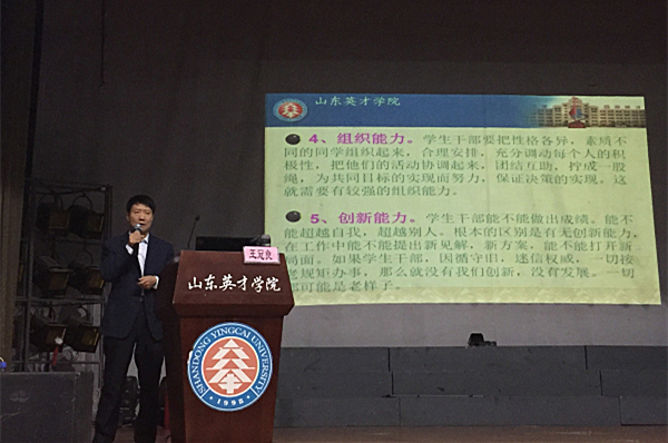 王冠良书记做的《谈变革,话发展,浅谈学生骨干如何成长》报告会围绕“对学生干部的认识”展开论述,首先,强调了学生干部的首要任务和使命,并以我院12级优秀学生干部胡悦的实例说明作为一名优秀的学生干部如何才能兼顾好学习和工作两个方面,其次,王书记对作为学生干部应具有的素质和应注意的问题进行生动的举例说明,并在“交往,分析问题,判断决策”等方面对学生骨干们进行了培训,最后,王书记从“三性”,“三高”,和“三心”以及处理好“六种能力”“五种关系”来概括了优秀的学生干部应具备的素质。王书记精彩的演讲以及与同学们间的互动使会议现场不时响起阵阵掌声,为当前学生干部存在的问题指明了方向。