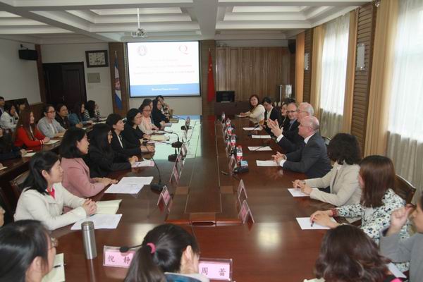 2016年4月7日下午六点,英国贝尔法斯特女王大学访问团与山东英才学院在办公楼大会议室举行了国际交流师生座谈会。女王大学中国区特使Prof.Sean Gorman,中国校区副院长Prof.David Rooney,医学、健康生命科学学院院长Prof,Colin McCoy,国际处中国市场主管Ms.Monica Yang以及山东英才学院外国语与国际交流学院院长张维娜教授,教学副院长林春玲副教授、学院的十余名老师和来自南北校区的中英合作班30位同学参加了此次座谈。