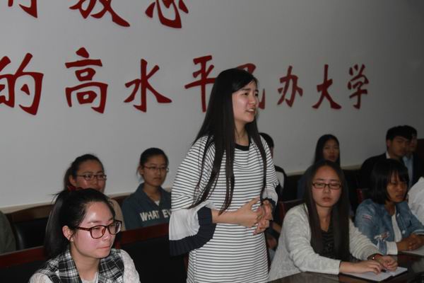 本次座谈主要就我校学生和老师所关心的问题展开讨论,解决同学和老师们的顾虑和困惑。会议开始,女王大学中国区特使Prof,Sean Gorman做了简短致辞并放映了微电影,为我院师生展示了女王大学的风貌,受到了大家的一致好评。之后女王大学各位教授就英才学院学生和老师的提问展开解答。座谈会期间,大家就是否可以硕博连读,毕业后就业情况,课程衔接等众多问题做出提问。女王大学领导也就这些问题做出了相应回答,他们指出在接下来的学习中女王大学将会派遣优秀老师到英才学院任教,为英才学生提供更好的平台,为将来到女王大学学习打下更为坚实的基础,并且在女王大学读研期间学校会为学生提供一定的创业资金,学生可以利用这些资金进行炒股,创业。在学习期间会安排学生到相关专业的大型公司实习,毕业后可以选择去澳大利亚或者留在英国就职,学校会为学生就业提供良好的平台。Monica教授还强调在英国硕博连读不需要参加任何形式的考试,只需要在平时的学习生活中表现优秀即可,在英国更加重视学生的平时表现。最后,我院中英本科15级学生赠送给教授们精心制作的具有中国特色的刻纸,表达了中国学生对英国访问团的热烈欢迎。
