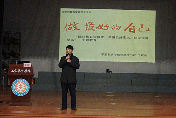 为了鼓励和动员学前学生铭记“自强不息、与时俱进”校训,带动“立德、博学、重能、求真”优良学风养成,建设“扬善修美、求真务实”的优良校风。学前教育学院党总支书记王冠良以“做最好的自己”为题,围绕践行核心价值观,共塑良好家风,同促优良学风等方面对15级学生展开了一场主题讲座。学院郑雯副院长带领辅导员老师与1000名学生共同聆听了讲座。