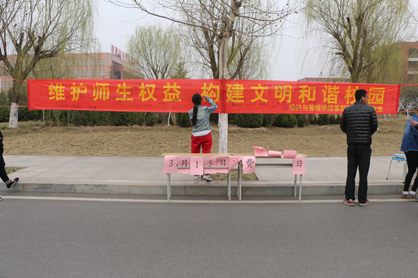 为纪念3・15国际消费者权益保护日,营造一个公平公正诚信经营的校园消费环境,培养大学生维护自身消费者权益的意识,2016年3月15日中午,经济与管理学院学生会生活部全体成员在食堂门口举办了消费者维权签名活动。