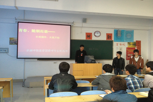会议的主要内容有以下四个方面:1、吸烟的危害;2、二手烟、被动吸烟的危害;3、部门吸烟率的比例调查;4、团学干部禁烟宣誓。会议上,袁虎首先讲解了吸烟的危害,劝诫吸烟的同学摒弃烟草,健康生活;其次,在部门吸烟率的调查中显示出,团学骨干中存在少量的吸烟人群,在会议上,袁虎提出了对部门吸烟人群的要求,同时李超、张峰表达了本部门“无烟建设”的决心。最后,袁虎、李超、张峰带领所有的纪检部部员进行了禁烟宣誓,表达了机械学院基层团委学生会纪检部响应学院的号召一起拒绝烟草的决心。