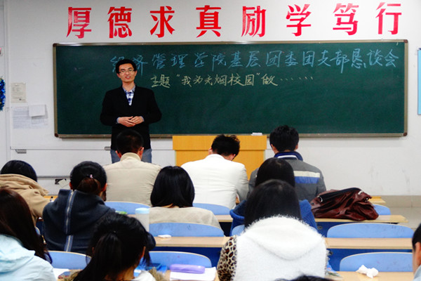 为号召广大同学远离烟草,构建无烟校园,4月7日经管学院基层团委举办了主题为“我为无烟校园做……”的团支部恳谈活动。活动采取进班宣传的形式倡议“无烟校园”,在同学们之间引起了广大热议,出席本次活动的有基层团委副书记、学生会主席田萌春,宣传部部长甄华国,外联部部长叶洋,文艺部部长陆迪和策划室副主任路宗伟。