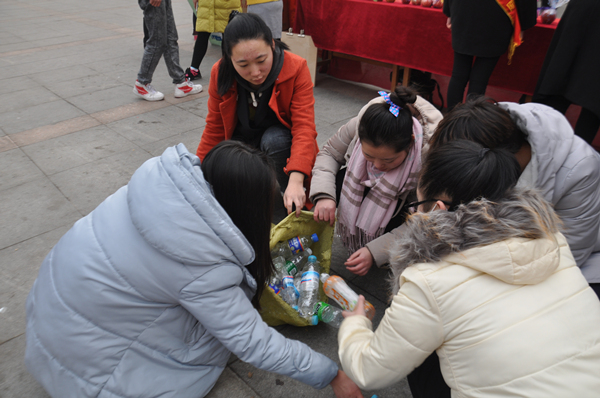 为提高大学生的环保意识,提醒大家废旧物品再循环利用、保护环境、节约资源, 2015年12月23日中午11点,由学前教育学院主办的“以瓶换苹”大型环保活动在大学生活动中心前正式举行。学前教育学院辅导员老师张维,学生会主席李林,学生会副主席杨磊,宿管会主席庄广雁,以及基层团委办公室主任马林清等各个基层团委学生会部长和外联部的全体成员参与了本次活动。
