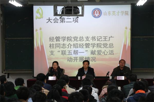 为进一步密切党群关系、师生关系,构建和谐校园,经济管理党总支于2015年1月5日在教学楼B100教室召开了“联五帮一”献爱心互动会。山东英才学院总务办主任于晓杰、经济管理学院党总支书记王广柱、经济管理学院学生党支部书记赵昆出席本次互动会。经济管理学院全体辅导员老师、受资助同学和部分学生代表参加会议,本次会议由学生党支部书记赵昆主持。