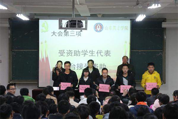 大会第一项,全体起立,奏唱国歌。接着,王广柱书记介绍了经济管理学院党总支“联五帮一”献爱心活动开展情况。经济管理学院党总支经民主推荐,各支部成员评议,最终决定对15级何亮亮等54名同学进行帮扶。同时也希望所有受资助的同学在以后的学习生活中,牢记党的教诲,认真学习,不辜负党和学院的期望。也希望其他同学以此为契机,勤奋学习,关心他人。大会第三项,于晓杰主任和王广柱书记为受资助学生代表发放了资助,受资助学生代表何亮亮同学发言。此次“联五帮一”活动充分体现了学校关怀,受资助同学会从点滴做起,感恩父母,感恩同学,努力学习,回报母校。会议最后,北校区管委会党总支代表于晓杰主任做总结,他讲到,要使贫困学生真正感受到英才学院这个大家庭的爱,受资助同学们不要辜负学院领导、广大党员对你们的厚爱和期望,要积极进取,发奋学习,立志成才,凭借自己的努力收获思想和学业上的双丰收。最后,全体起立,奏唱《英才之歌》,大会在嘹亮的校歌中圆满结束。