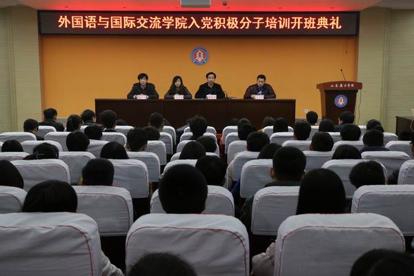 2015年12月21日下午17:30在北校区学术报告厅举行了入党积极分子培训暨开典礼仪式,外国语与国际交流学院教学党支部书记徐贵丽、行政党支部书记曲永存、学生党支部书记祝景朋出席了此次开班典礼,2015级160余名学生参加了入党积极分子开班典礼仪式,此次培训会议由党支部委员李文甲主持。