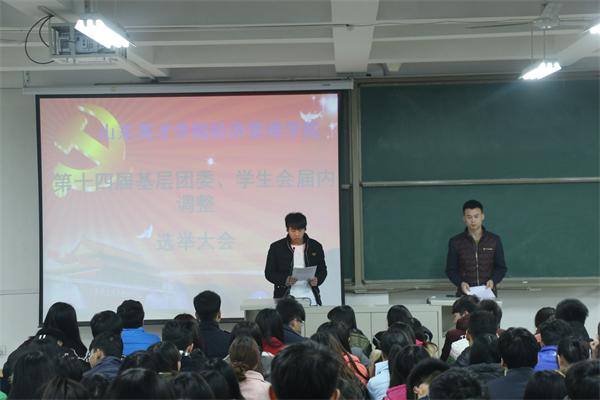为更好的服务广大师生,促进学生管理工作的发展, 2015年12 月23日,经济管理学院在经管楼B-100教室召开了基层团委、学生会界内调整换届选举大会。学生会主席杨鑫及副主席郝文笑、徐文正,何晓慰、任佳芳出席会议。