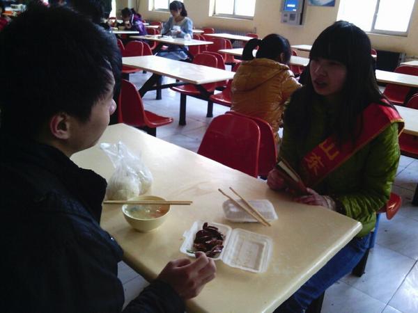 本次活动组成了以外国语学院学生会副主席邓钰为组长,陈杰为副组长,各班级班委为组员的10人 “光盘小组”。活动期间,“光盘小组”成员利用学生就餐时间积极活跃在二食堂的各个角落,他们对就餐的老师和同学们进行了现场采访和沟通,并向他们提倡勤俭节约,拒绝“剩”宴声音。现场的老师和同学们积极的进行了回应,其中计算机学院一名老师说,在大学开展这样的活动非常有意义,能够让大学生提高勤俭节约的意识,养成良好的生活习惯,树立了正确的生活观、价值观,营造了争当“光盘一族”光荣,饭桌浪费一粒粮食可耻的饮食文化氛围,践行了尊重粮食、节约粮食的传统美德,并且希望这样的活动要持续下去。被采访的学生讲到,学生应该勤俭节约,不浪费粮食就是不浪费家长给的生活费,才能体会到家长辛苦,并且表示大学生应该做到净盘、净桌、净地面,还要将光盘行动带回家中去,提醒家人和亲朋参与到“光盘行动”中来,共同创造一个良好的饮食环境。