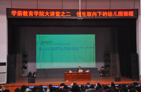 2015年12月10下午2时,学前教育学院在在大学生活动中心举行了“创生取向下的幼儿园课程”专题讲座,此次课堂由山东师范大学向海英老师亲自授课,出席此次讲座的有学前教育学院教学院长刘艳珍,以及学前教育学院的师生六百余人。