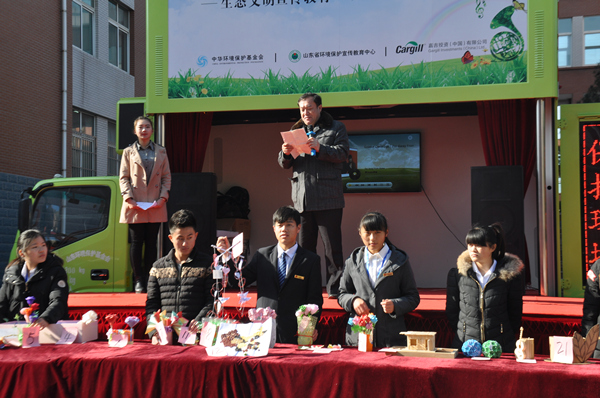 本次活动一共有六项,首先是由宣教中心副主任王明远致辞,他表示非常高兴在山东英才学院的学前教育学院举办此次活动,希望通过本次活动,能让大家认识到保护环境的重要性。第二项是宣讲员演讲,宣讲员指出现在环境污染严重,呼吁大家保护环境。第三项是抢答环节,由主持人提问有关环保的问题,台下同学们进行抢答,回答正确的同学可获小礼物。在此环节中,同学们积极踊跃的举手抢答,答题结束后,一个个小玩具挂件抛向激动且兴奋的同学们。第四项为环保服装走秀展示,此次服装展示有用报纸做的拖摆礼服,层层叠叠,荡起一圈波浪;也有蚊帐做的婚纱,雪白的纱裙,缥缈如仙……各式各样的材料,不同风格的衣服,让观众们大为称赞。走秀结束后,由现场观众选派代表上前投票,选出最美的环保服装。最后,学生代表金跃宣读了环保倡议书。