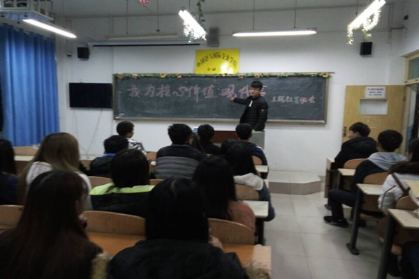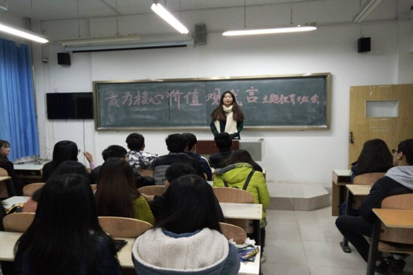 此次主题班会各班同学都做了充分准备,在各班主讲人的带领下同学们都踊跃发言.有学生讲到青年大学生是新一代有理想有抱负的学子,是祖国的未来,应该树立正确的人生观,世界观,价值观,将社会主义核心价值观这一面旗帜永远飘扬在新一代外事学子心中。有的学生讲到作为新一代青年学生,理应把爱国,敬业,诚信,友谊这八个字社会主义核心价值观落实到现实生活中;还有的学生讲到尊重我们的父母,老师,同学,爱护我们美丽的校园,在校园里做好自己的本职工作,努力学习,全面发展,凝聚正能量.