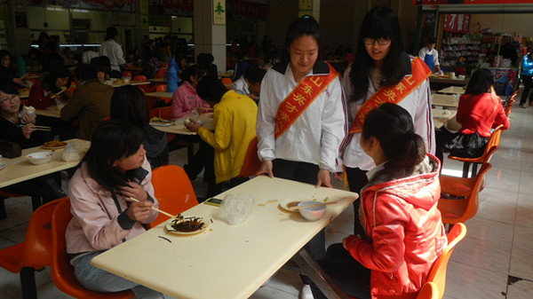 我们希望同学们就餐时要以“光盘”为荣,“浪费”为耻。在食堂吃饭时,做到依自己的用量买饭菜;外出吃饭点菜时候做到适度,适量,吃饱为好,实在吃不了时,记得“兜着走”;在家吃饭时记得吃多少盛多少,不挑食,不扔剩菜剩饭。鼓励同学们不仅自己要带头节约,还要带动身边的人。从自己的家庭坐起,发动和监督亲朋好友都参加到“关盘行动”中来,做一名“节约达人”。在学校食堂用餐,同学们不但要爱惜粮食,还要爱惜餐具(筷,碗,盆等),用餐完毕应该将自己的餐具收归到餐具集中处,对任意损坏餐具、用完后立即空手就走的行为说“不”!