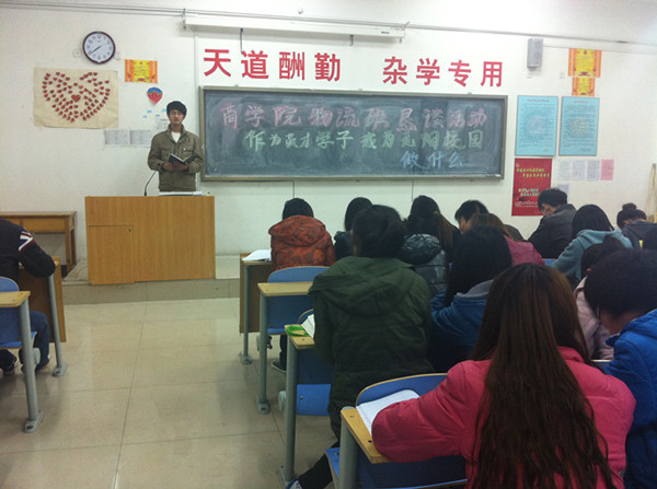 商学院2011级物流管理3班开展班级团支部恳谈活动,会议由吕小龙负责主持,他在恳谈会上提出了 “我为无烟校园做什么”不仅仅是一次恳谈活动,而是要持续开展的一项活动。由于大家都是一个班级的,相互间都比较理解,容易沟通,所以吕小龙同学直言不讳的指出了班级中抽烟的同学及其他同学的一些不文明现象,对于他的诚恳批评,班级的一些同学也纷纷表态,表示自己以后一定会以一个大学生的要求来严格要求自己,通过班级分组讨论会,在班级全体同学的举手表决下,班级分为4个小组,每周进行小组评比,评比内容包括吸烟、乱扔垃圾、旷课等几大方面。