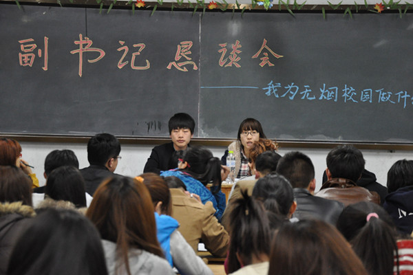 本次恳谈会的主要目的是与各班级团支部交流一下前期工作,传达学院关于禁烟的主要精神。会议开始,王静和同学们进行“我为无烟校园做什么”的简单交流,同学们积极交流关于戒烟的方法和吸烟的坏处以及如何组织吸烟行为的发生,使同学们了解到吸烟的危害性及学院关于禁烟活动的意义。在讲解的过程中,同学们都认真的发言和进行记录。