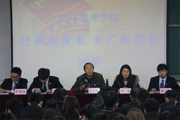 2015年12月8日中午12点整,于经管楼B300教室举行了经济管理学院基层团委、学生会全体干部会议暨届内调整大会。出席本次换届大会的有经济管理学院行政副院长王广柱、基层团委书记赵昆、学生会主席齐放、基层团委副书记黄涛、学生会副主席李杨杨以及学生会所有干事。