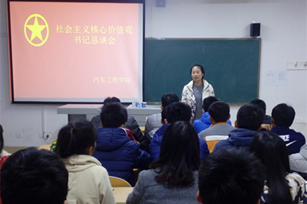 此外,汽车工程学院在汽车楼4005教室举行了以“社会主义核心价值观”为主题的书记恳谈会。会上,汽车工程学院基层团委书记陈迎春表示,学生会干部要在培育和践行社会主义核心价值观中发挥积极表率作用,要不断增强对核心价值观深刻内涵的认知和学习,践行核心价值观首先来自对价值观的高度认同和极度自信。她还鼓励同学们继续深入学习和领会社会主义核心价值观,并认真学习好党的十八届四中全会精神,进一步联系实际进行学习。