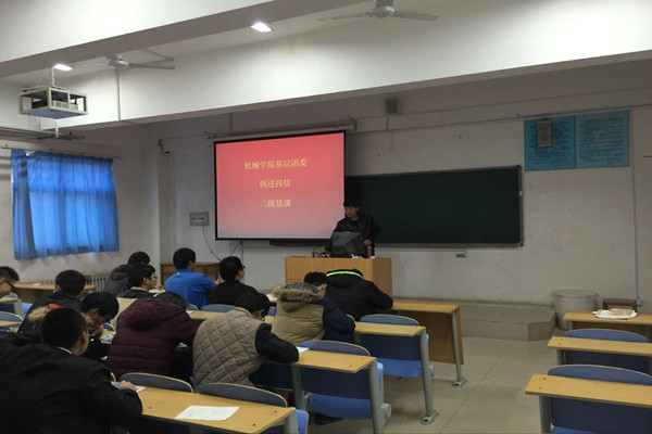 为加强广大团员思想政治引领工作,深化对“四进四信”的理解认识,2015年12月8日晚8时,机械学院基层团委办公室主任徐佳祥在实训南楼4009教室15级机电二班开展了关于四进四信团支书恳谈活动。