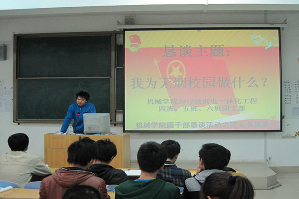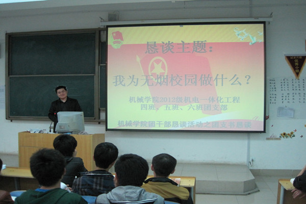 为树立和展现我院青年团员良好的精神面貌,养成良好文明的生活习惯,创造文明、洁净、优美的校园环境。机械学院基层团委学生会向全院同学发出倡议――“打造无烟校园”!让我们一起行动,让教室、宿舍、公共场所不再乌烟瘴气,让烟蒂、烟盒在校园销声匿迹;同时,机械学院各团支书积极组织开展团干部恳谈活动。2013年4月16日,机械学院12级机电一体化工程四班、五班、六班团支部举行了“我为无烟校园做什么”团支书恳谈活动,班级辅导员刘宝峰老师出席了本次恳谈会,恳谈会由团支书丁代卫主持。