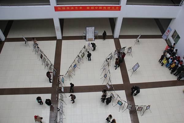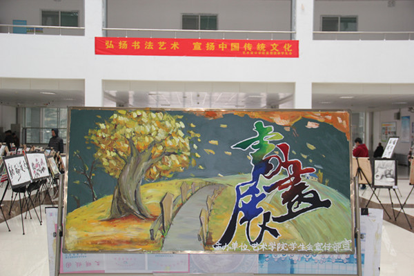 为了丰富广大学生的课余文化生活,展示当代大学生的风采,全面提高我院学生的综合素质,进一步营造科技文化艺术节气氛,推动我院校园文化建设再上新台阶,由艺术学院学生会主办的金秋书画展于11月18日中午在北校区图书馆拉开序幕。