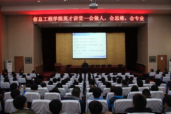 为了更加端正信息工程学院学子们的学习态度、学习方向,2015年11月24日刘郁院长在学术报告厅开展了信息工程学院英才讲堂-会做人,会思维,会专业讲座。参加本次讲座的有行政院长赵全华院长、团委书记米晓青书记,全体辅导员老师和信息工程学院学子。