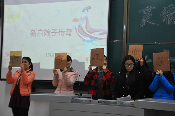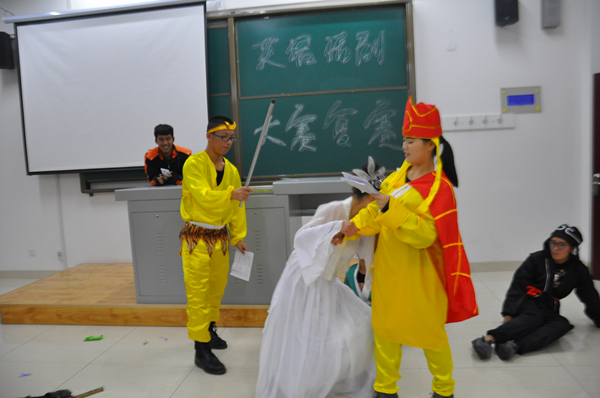 比赛前,所有的参赛班级在候场室做最后的准备,有的同在紧张的排练,有的同学在背台词,还有的同学在听音乐缓解紧张的情绪。随着主持人宣读完比赛规则后,比赛正式开始。专本套读3班表演的《守株待兔》给观众们带来一片欢声笑语,夸张的动作,流利的语言,恰到其处的表情神态,让观众们毫不吝啬的送出阵阵掌声。而本科4班带来的《新白娘子传奇》则给观众带来了不一样的视觉冲击,同学们表达流利,表演投入,剧情幽默风趣,古灵精怪的小青,严肃的法海,和大家所熟知的《新白娘子传奇》有着相同的人物却有不一样的结局,经过改编的话剧赢得了台下观众的热烈掌声……各个班级表演各具特色,风格迥异,实力不相上下,也让现场的观众对此次比赛的结果更加期待。