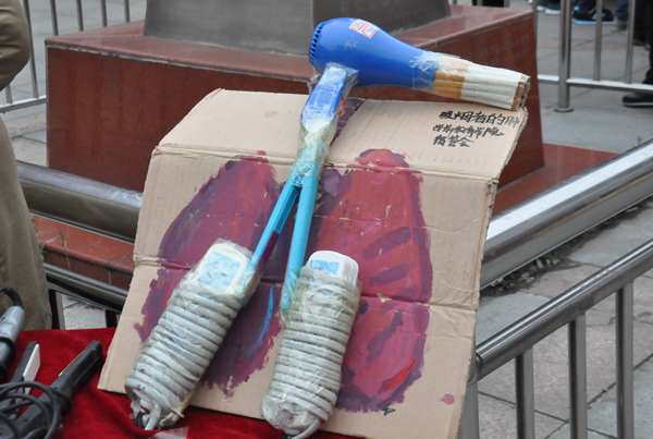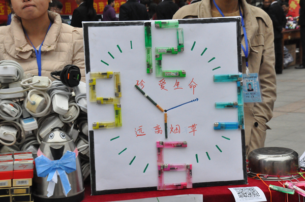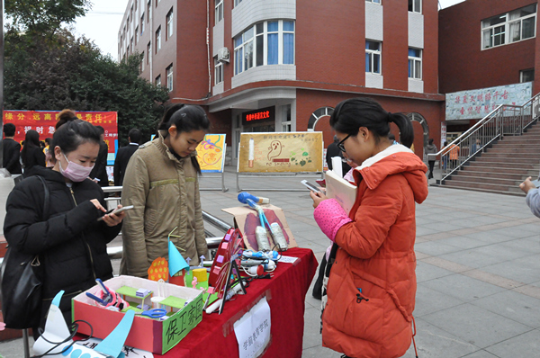 在大学生活动中心的道路两旁,身着正装的同学们举着大学生宿舍自我管理委员会的旗子,红色的旗帜迎风飘扬,道路上熙熙攘攘的人们很快被吸引到了展桌前。各二级学院宿管会的成员对展品进行了详细讲解,并告诉同学们在宿舍使用违禁物品有可能造成的伤害。此次违禁物品展示很是震撼人心,如电吹风机,直板夹,卷发棒等无数大功率电器在展桌上给路人以视觉上的冲击,更给人以心灵的震撼,对于全校学生来说则是一次深刻的教育,来来回回的同学纷纷驻足,观看此次违禁物品展出来的东西。而各个二级学院宿管会的同学们对于此次展品更是别出心裁,我院的违禁物品经过宿管会成员的改造下做成了独具学前特色的工艺品,而其他学院也是独具匠心,将收缴上来的违禁物品做成了一幅幅画展,机器人,钟表等。来往的同学们也都拿出手机,打开微信为自己喜爱的作品投票。