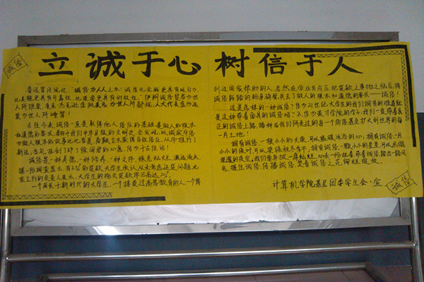 针对大学校园助学贷款、困难认定、评奖评优、资格证明、缴纳学费求职过程等方面存在的不诚信问题,信息工程学院根据这一问题发出倡导,并制作手绘展板展示于B楼三楼。