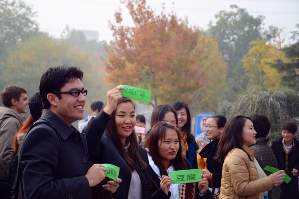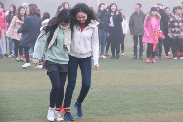 在接下来的趣味活动中,中外学生共分成5支小团队,每支小团队有8组,每组有一名中国学生和一名外国学生组成。5支小团队进行了螃蟹走路、齐步走的比赛。在活动中大家共同努力,配合默契,奋勇争先,既讲竞技,又讲友谊;在欢声笑语中,中外学生的友情得到升华,活动也达到了高潮。