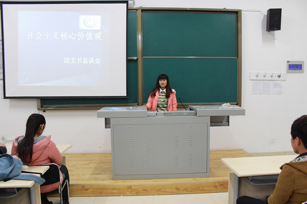 本次恳谈会由15级实践本科物流管理一班的团支书李心茹主讲,她提到党的十八大把社会主义核心价值观教育提升到振兴中华民族之举的高度,以爱国主义为核心的民族精神和以改革创新为核心的时代精神,反映了社会主义核心价值观是一个面向时代、立足现实,与中华民族传统文化承接、与社会主义先进文化相一致的体系。“倡导富强、民主、文明、和谐,倡导自由、平等、公正、法治,倡导爱国、敬业、诚信、友善”为主要内容的“三个倡导” 是“社会主义核心价值观的基本内容”,是着力建设中华民族共有的精神家园,是推动形成奋发向上、崇德向善的强大力量。作为我们团学干部,是国家的希望、民族的未来,践行社会主义核心价值观,不仅是帮助大学生树立正确价值观的需要,更是帮助大学生树立正确理想信念的需要,是帮助大学生树立诚信意识的需要,也是帮助大学生培养良好道德的需要。我们团学组织,要把丰富多彩的校园文化活动作为进行社会主义核心价值体系教育的有效载体,调动大学生学习社会主义核心价值观的积极性,需要着力培养良好的校园文化。让大学生在活跃、轻松的学习氛围中受到教育、获得启迪。并指出“富强、民主、文明、和谐”是国家治理层面的价值取向。“自由、平等、公正、法治”是社会治理层面的价值取向。“爱国、敬业、诚信、友善”则是国家治理对公民个体的价值要求。