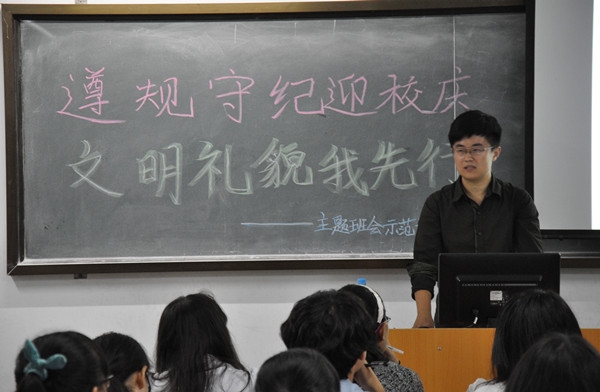 山东英才学院学前教育学院主题班会示范课于 9月7日 晚七点在教学A楼3004教室正式举行。本次会议邀请2011级普本一班团支书张丰,学院基层团委办公室主任王敏敏,科技创新部部长盖敏参加,以及基层团委科技创新部干事和学前教育学院2013级全体班级团支书。