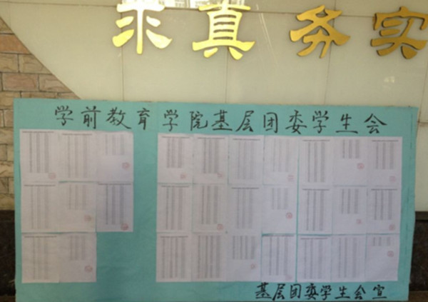 9月5日和9月6日 ,按照学远的统一部署,经过基层团委学生会所有人的认真努力,学前教育学院基层团委学生会于A楼大厅对基层团委学生会的面试结果进行了为期两天的公示。许多大一新生争相关注有关部门的面试结果,急切的寻找着自己的名字,紧张激动的心情溢于言表。新生们一边观看着,一边互相交谈,遇到同一部门的,激动地拥抱跳跃,又结交了新的朋友,脸上洋溢着兴奋的笑容,流露出对即将开始的充实的大学生活的憧憬。